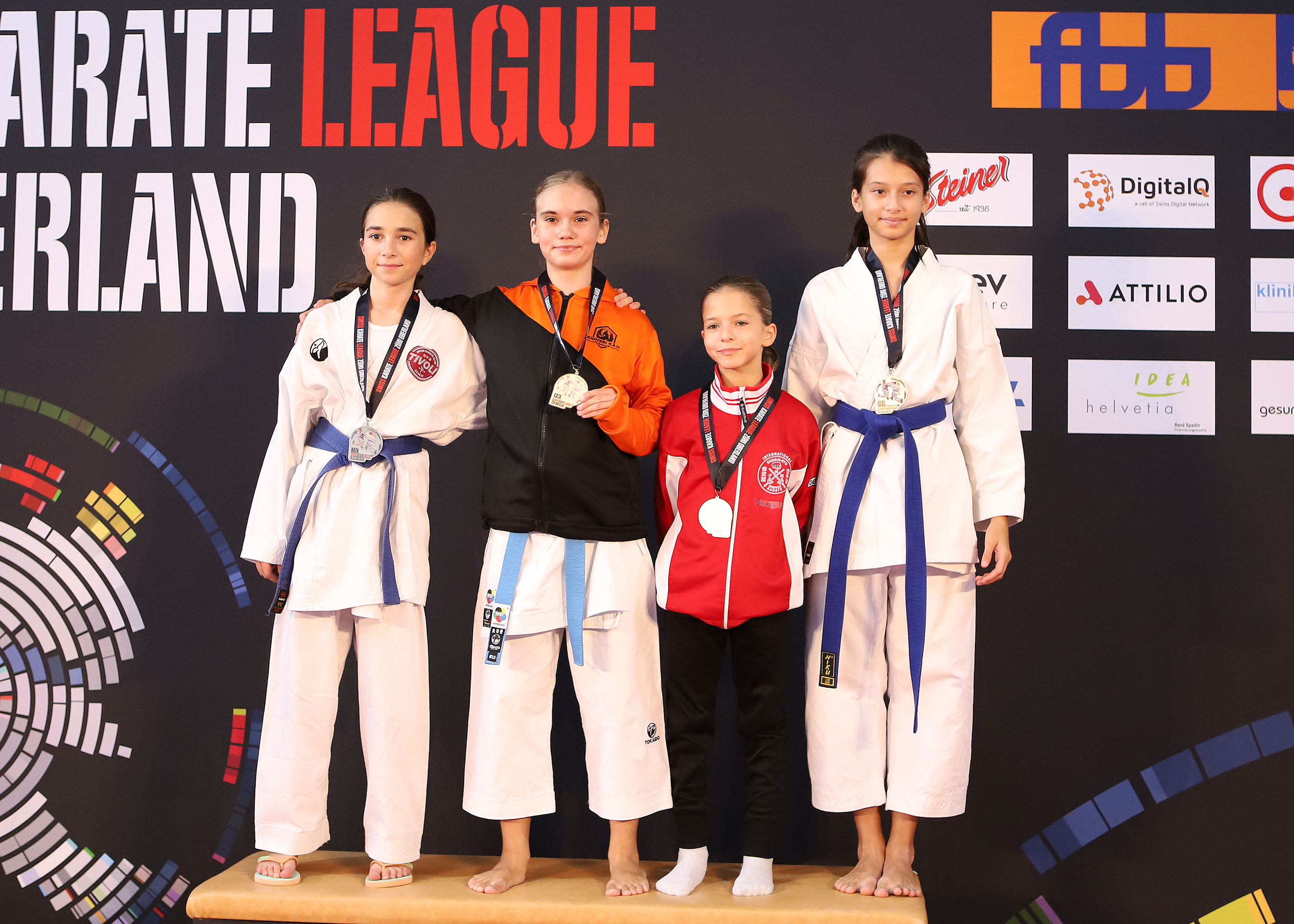 Siegerehrung, Schweiz, Swiss Karate League, 2025, Gossau, Züri Oberland, KARATE - CLUB SENSE DÜDINGEN - RIFFENMATT, Rajana Hyda, Neva Spicher, Klea Kryeziu, Soli Hildenbrand